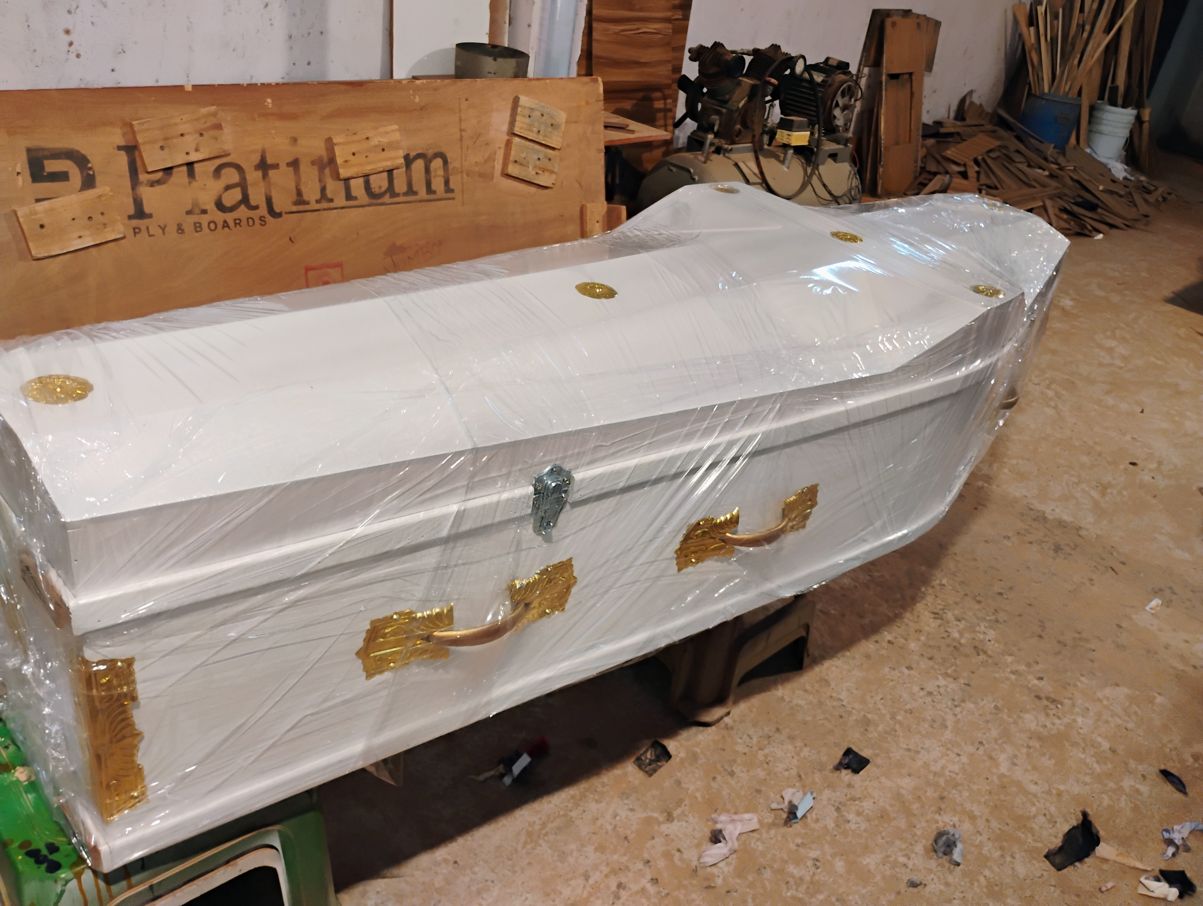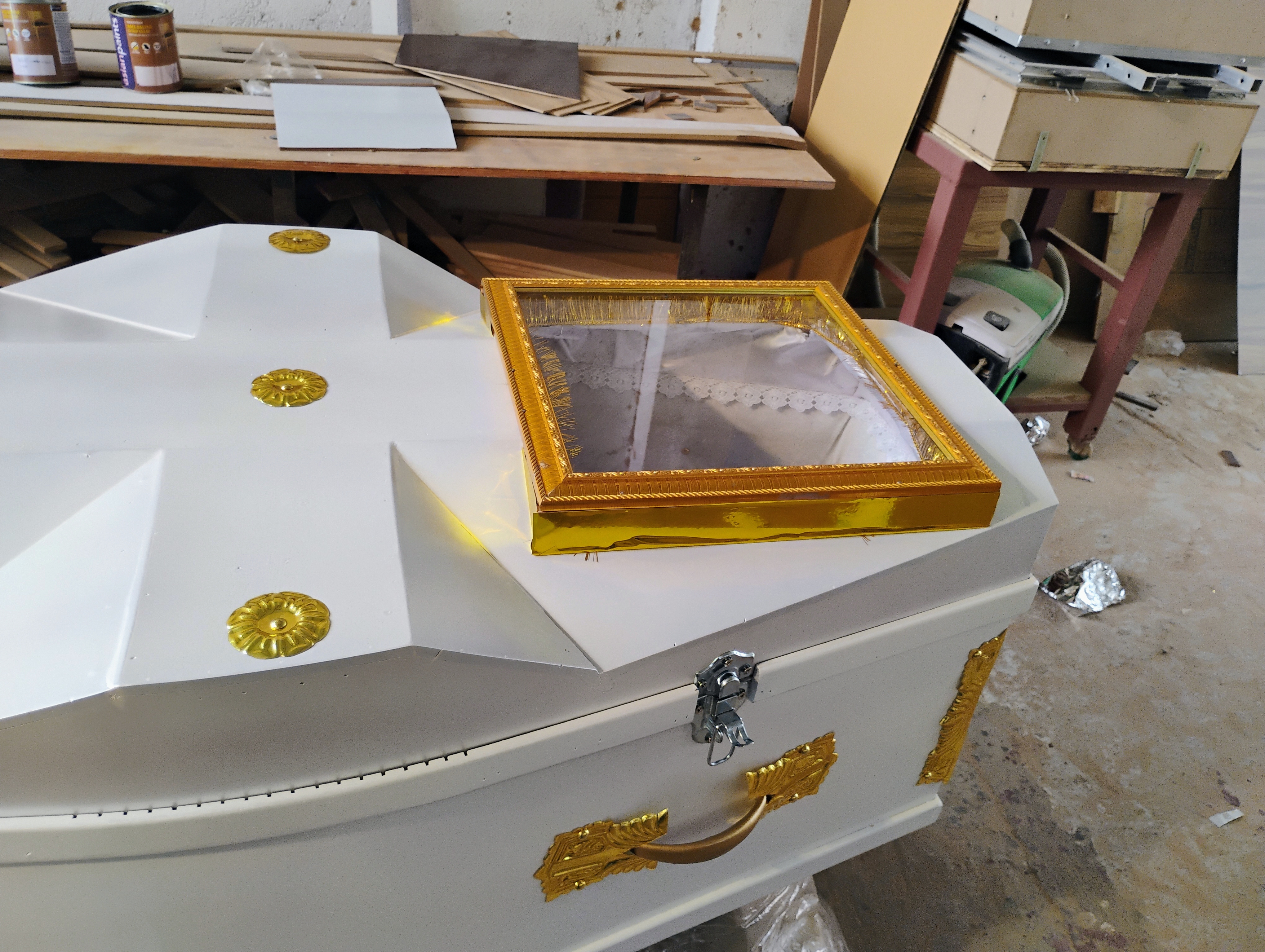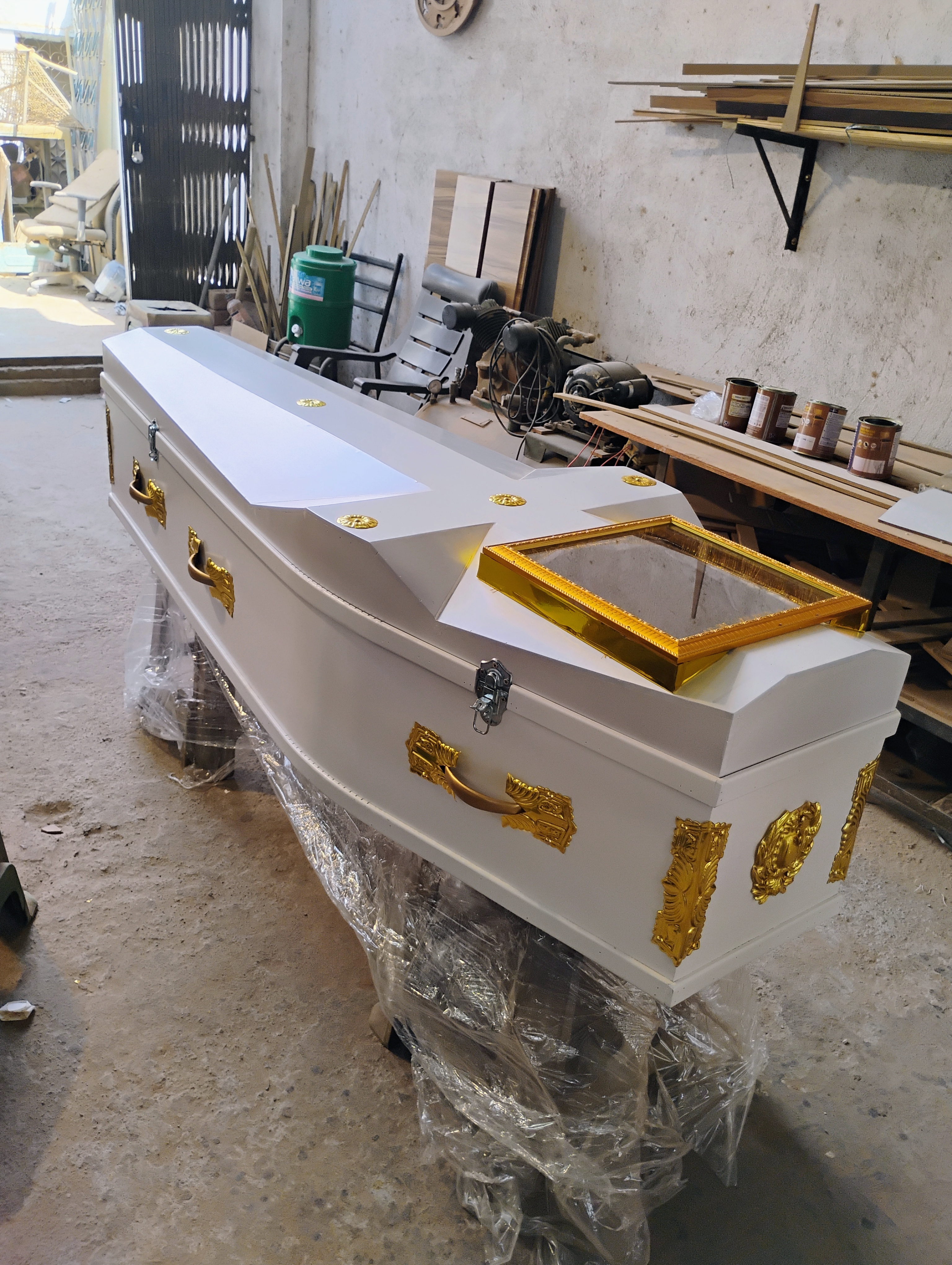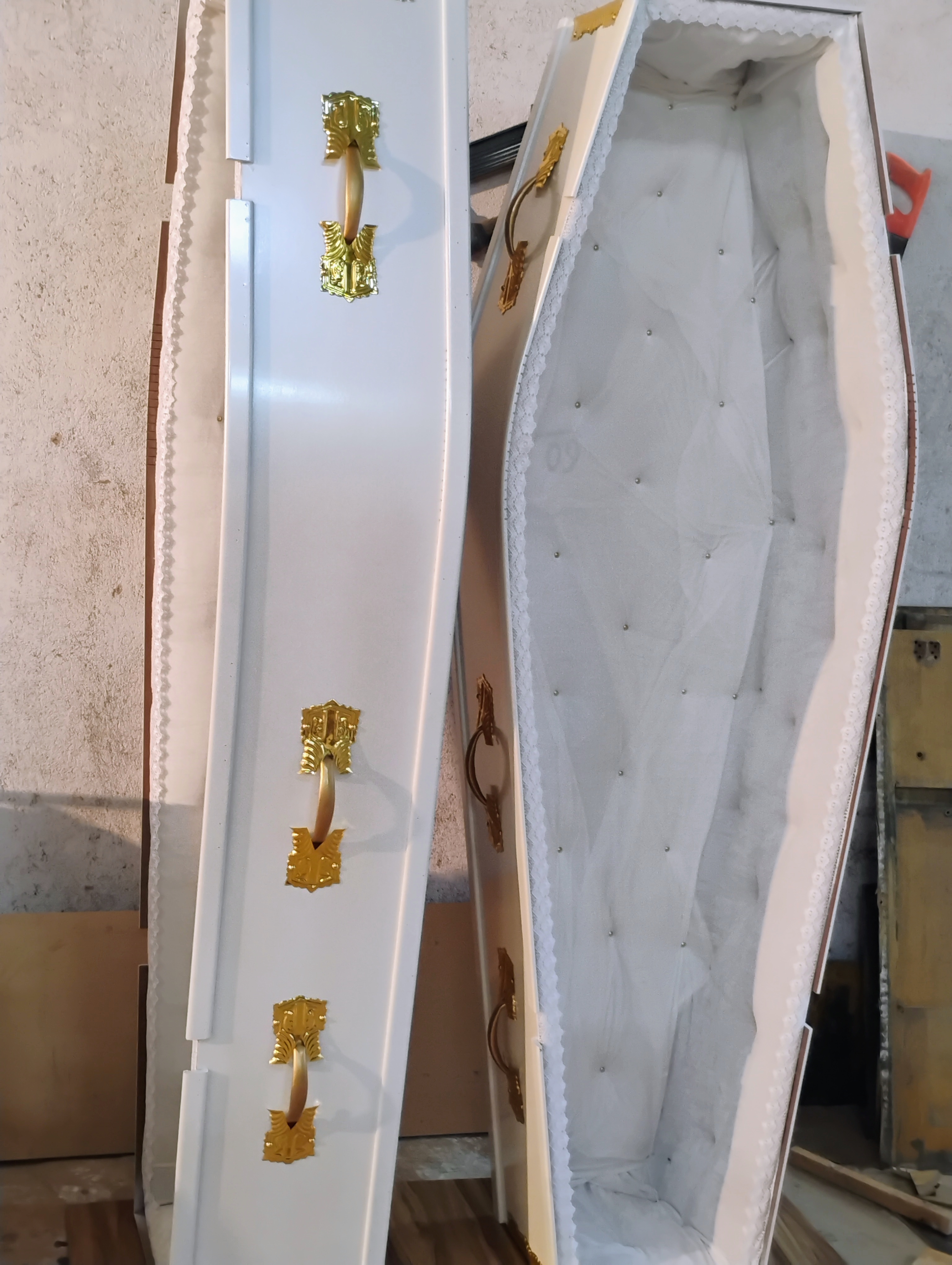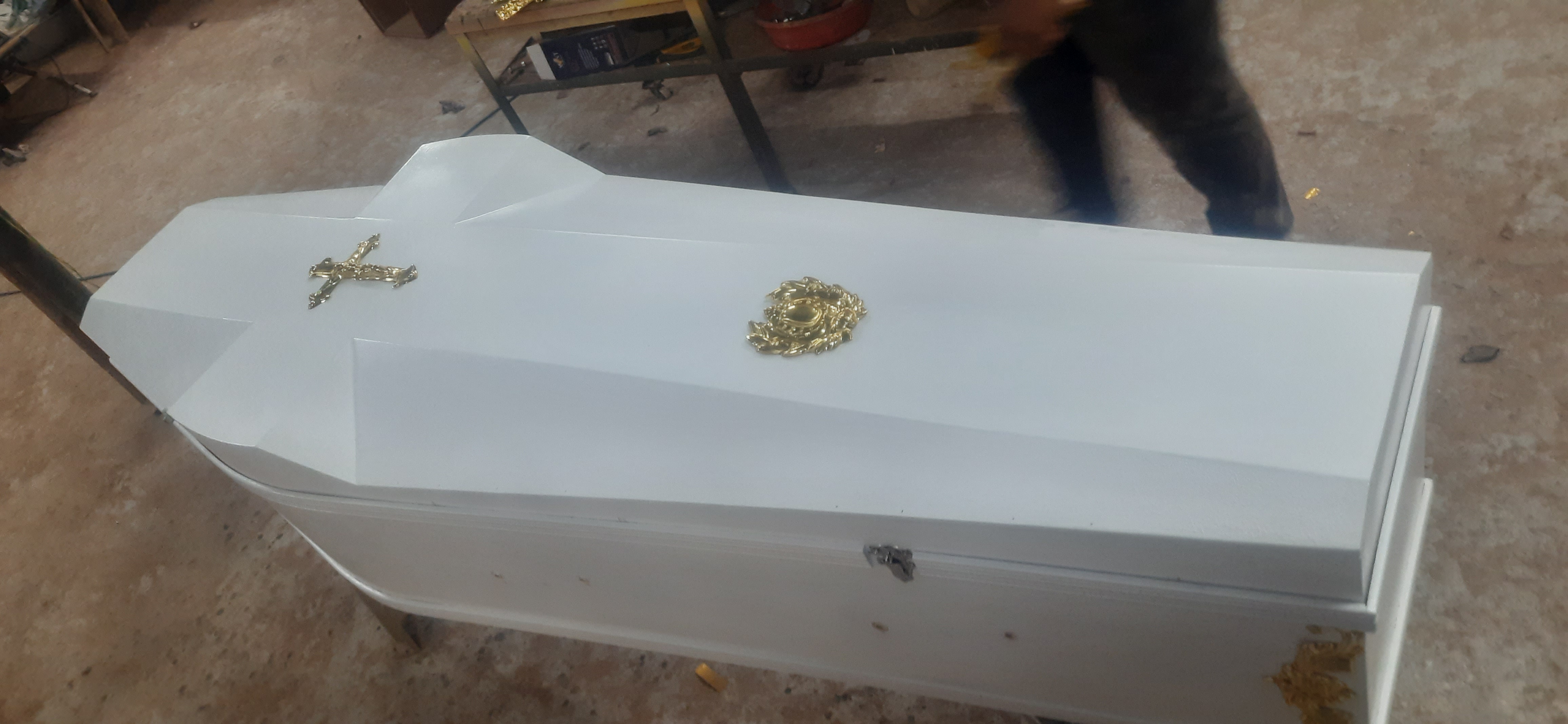 Pearl white full cross coffin with / without glass for face.